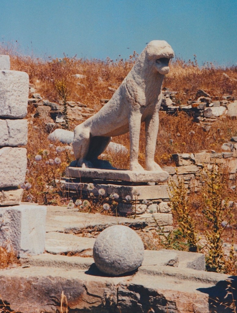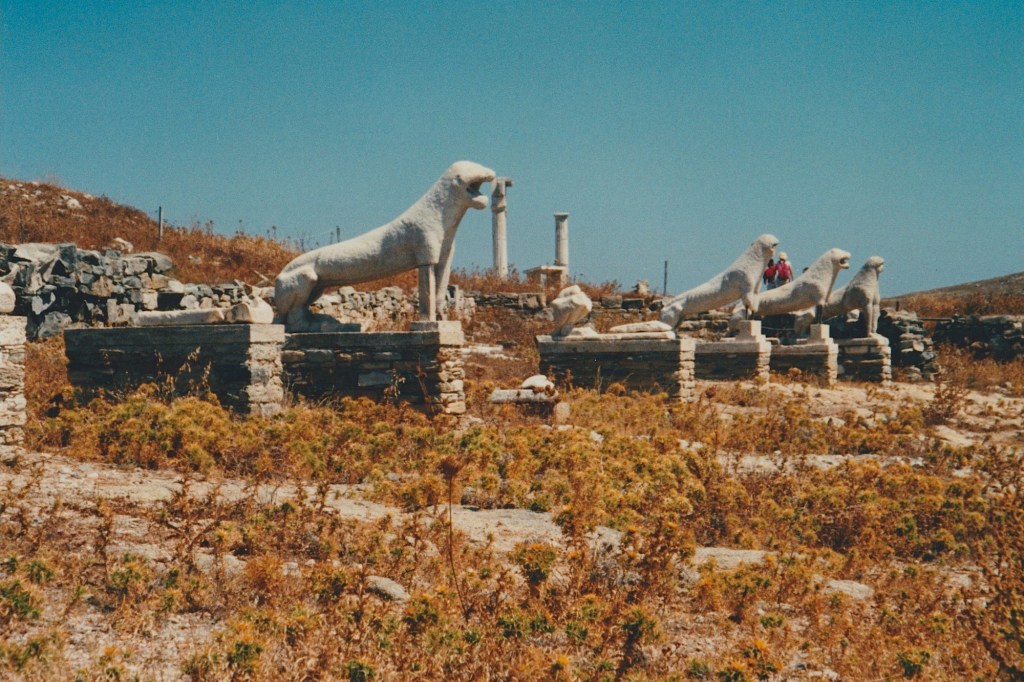 In the 7th century BCE, the nearby islands of Naxos and Paros – sources of superior marble – were Delos’s most notable patrons. The Naxians, who were thought to control the island at the time, dedicated to Apollo a colossal statue of the god and an estimated nine to 16 marble lions, which flanked the sanctuary’s original approach, the Terrace of the Lions.