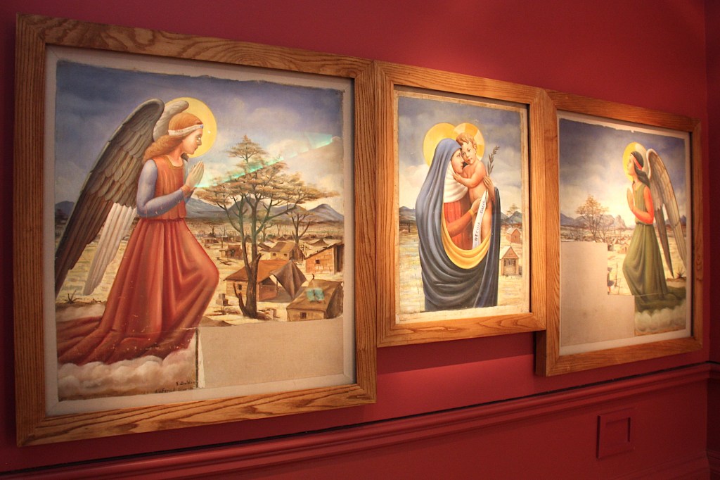Using the only materials available to him in the austere desert camp, Baldan painted the Madonna, Christ and angels on the back of flour bags. The background, far from grandiose or romanticised, depicts the POW camp, including the chapel where the paintings were installed above a makeshift altar. In an inconspicuous corner of one canvas, the Italian flag is disguised as washing on a line.