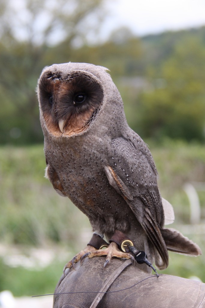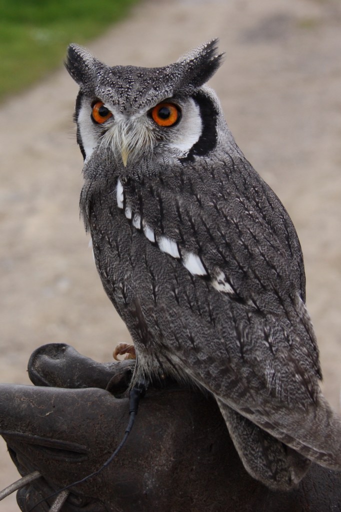 Not all owl species are nocturnal, we discover. Owls with yellow irises tend to hunt in the daytime; those with orange irises generally hunt at dawn and dusk; and those with dark irises are usually nocturnal hunters. So, if we’re keeping any of these owls from sleeping (not that they seem to mind), it’s the two barn owls: Henry, a soft-faced white bird with dark eyes and delicate wing patterns; and Oreo, a rare black melanistic barn owl.